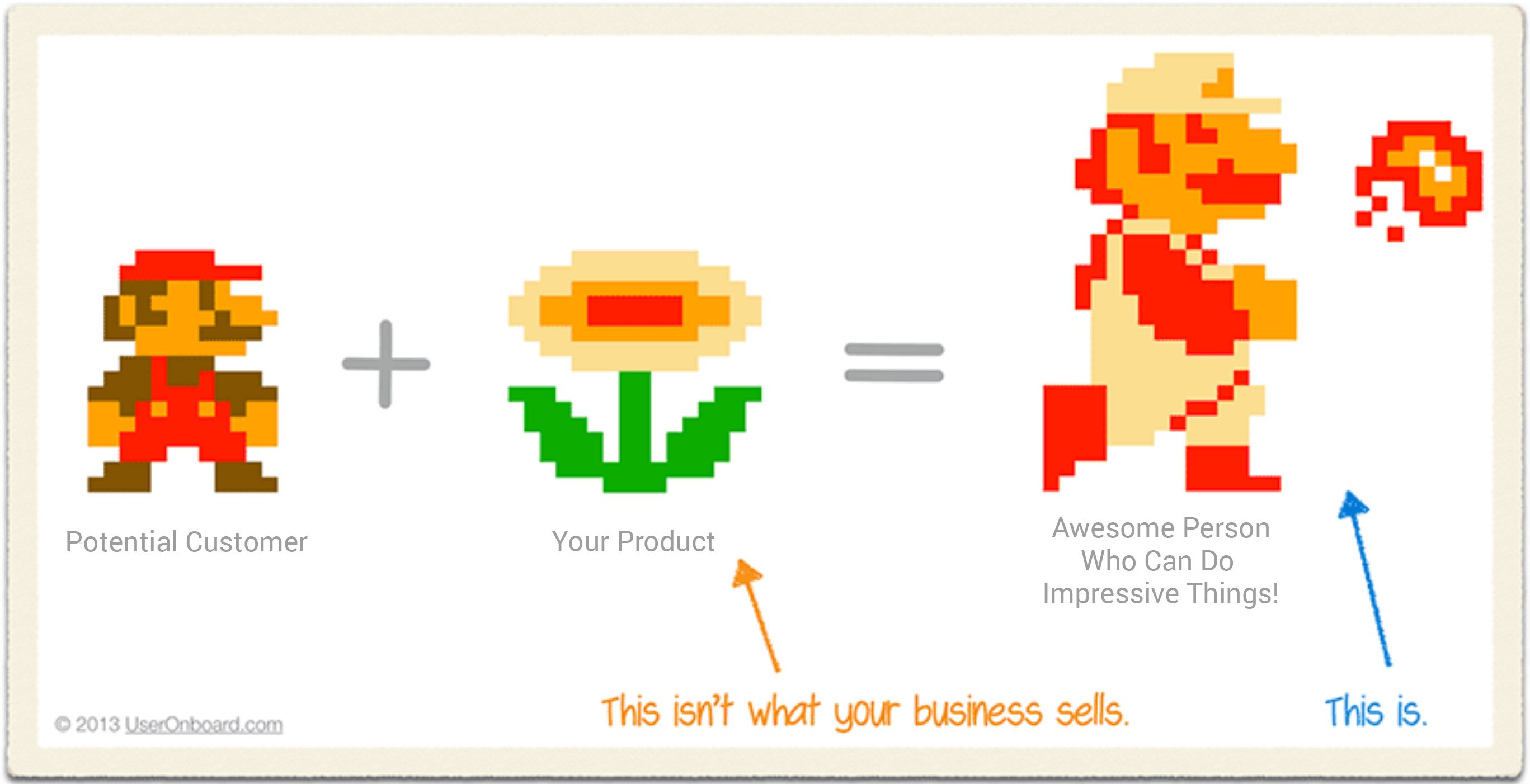 This is something that most people get wrong. Your customer in the example above, Mario, is buying your product, the flower. However, this isn’t really what Mario cares about. What he really wants is to do is throw awesome fireballs, or in sales terms, what your customer can do with your product. If you’ve been focusing on selling the flower, you’ve been doing it wrong.